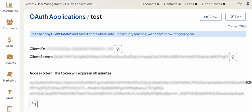 Use the generated Client ID and Client Secret to retrieve an access token to connect to your Oro application.