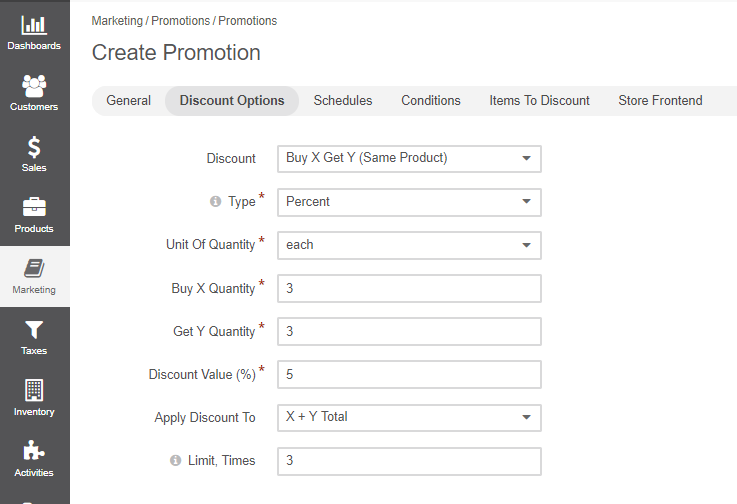 Buy X Quantity — Enter the quantity of X products the customer needs to purchase to be eligible for the discount.