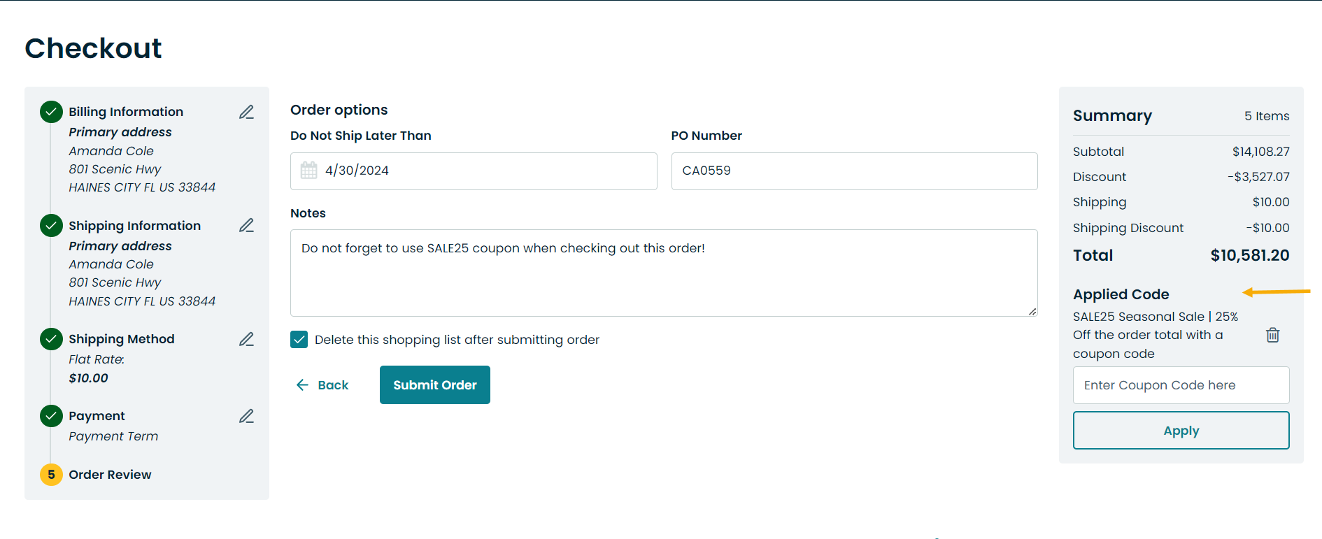 Storefront Labels — Specify the label (e.g., the promotion name) that will be displayed in the Order Summary section of the checkout in the storefront (illustrated below) alongside the coupon code. If left blank, the name of the promotion linked to the coupons will be used as the label.
