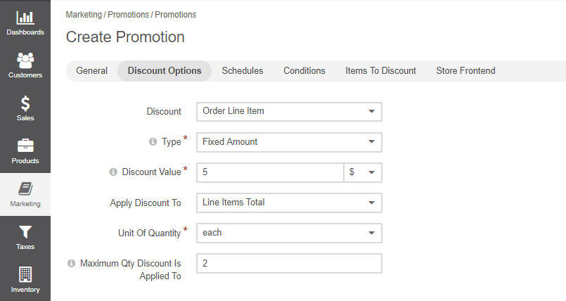Depending on the discount type, the remaining fields in the Discount Options section will differ. See the following sections for their detailed description: