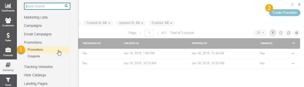 Navigate to Marketing > Promotions > Promotions in the main menu.