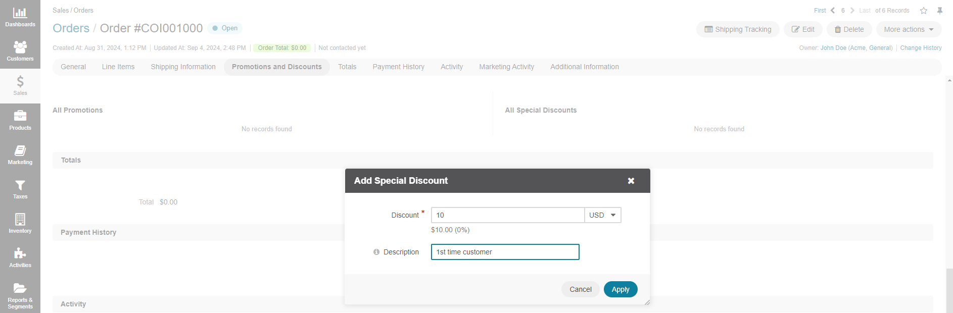 On the order page, click Add Special Discount from the More Actions menu.