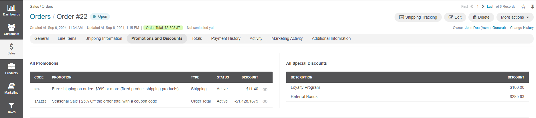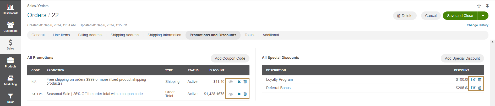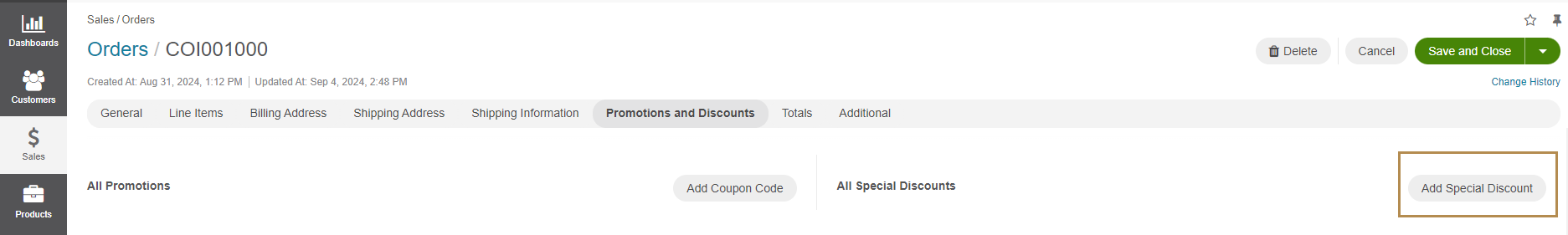 You can view discounts applied to a specific order under the dedicated Promotions and Discounts section on the order page. This section is divided into All Promotions and All Special Discounts.