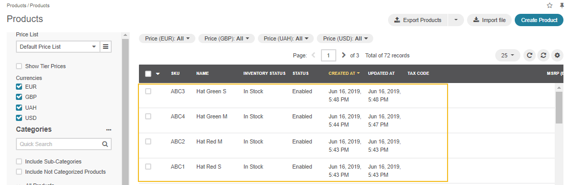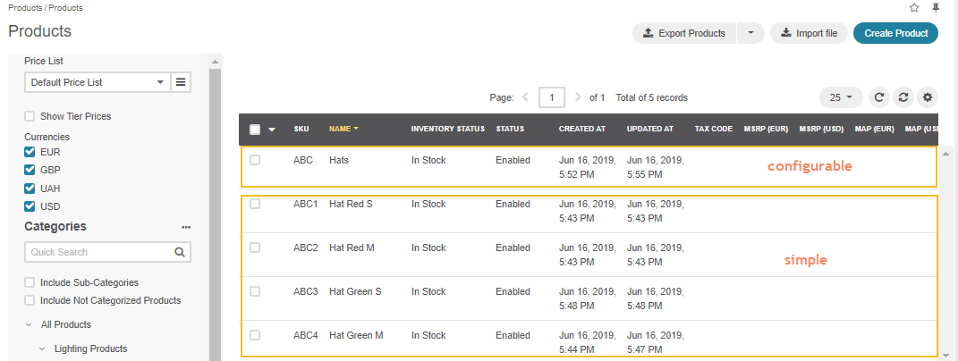 Created product variants (simple products).