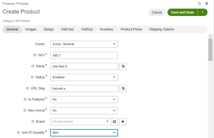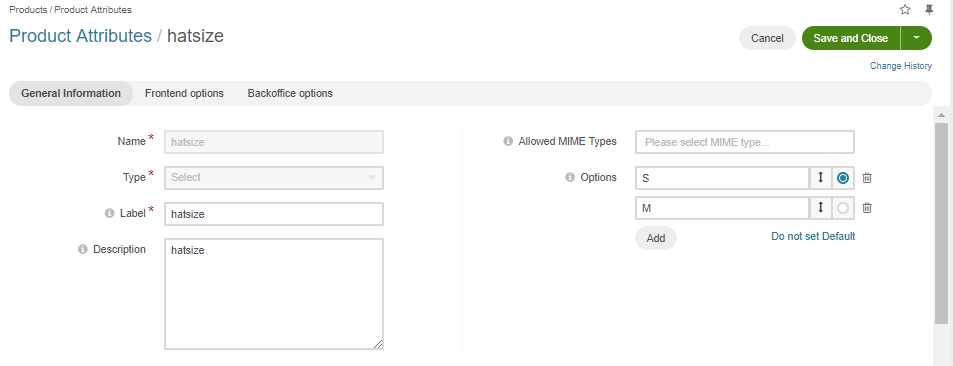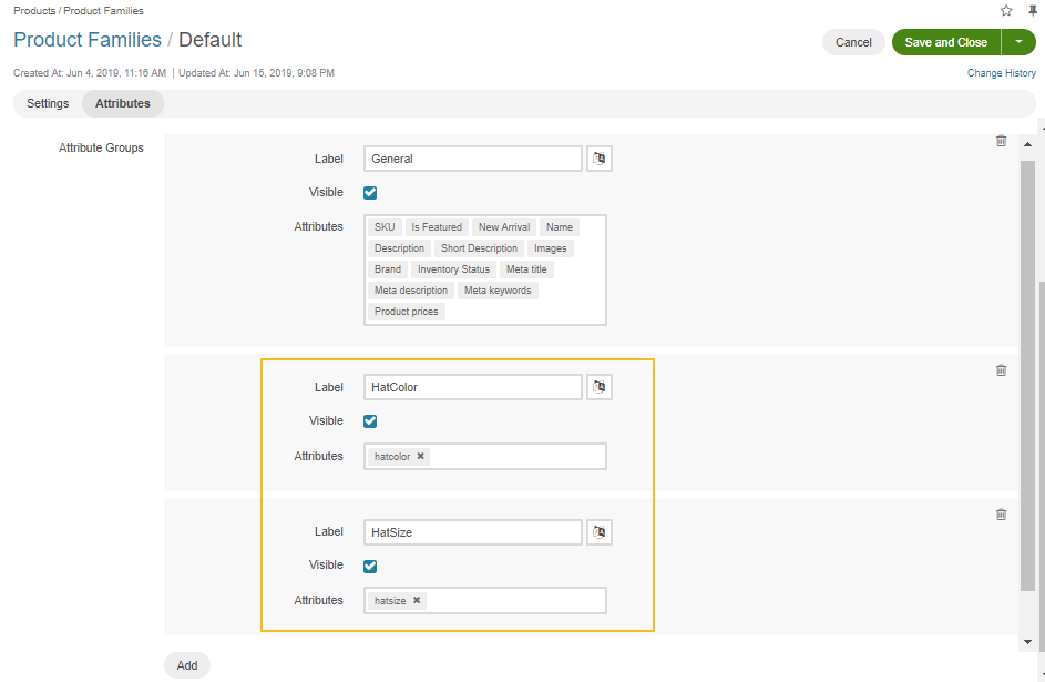 Fill in the required information and add attributes ‘HatColor’ and ‘HatSize’ to the attribute group by clicking +Add.