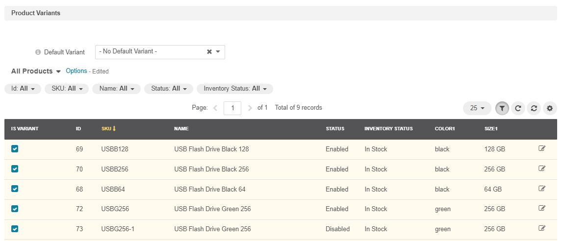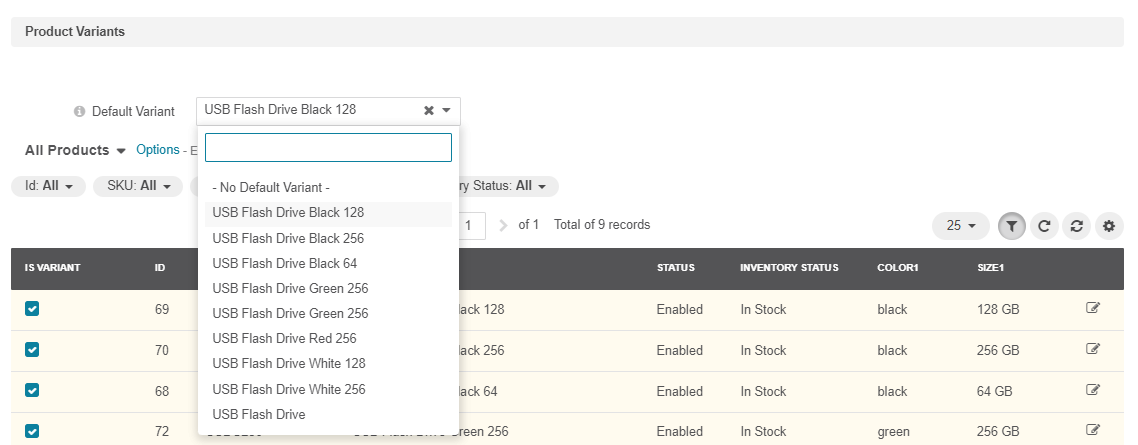 Once all variants are selected, you can choose the default variant to be displayed in the storefront by selecting it from the Default Variant dropdown list. The setting is available as of OroCommerce version 6.0.6.