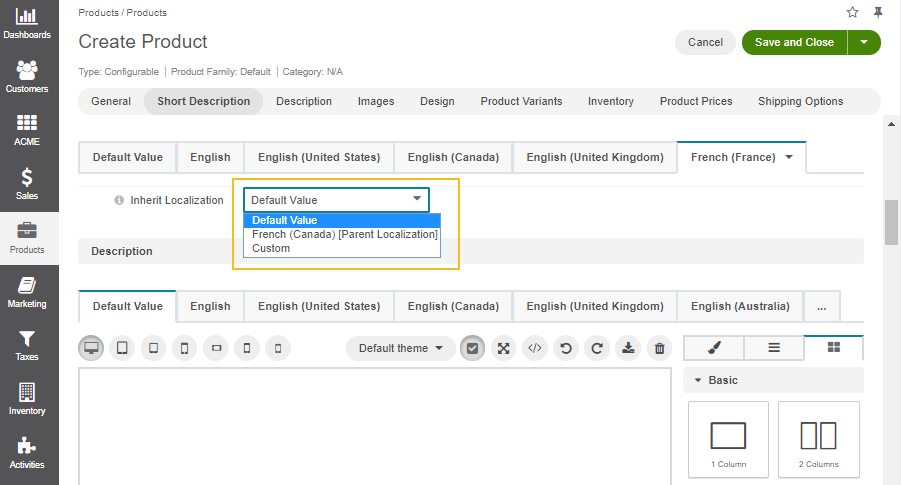 In the Short Description section, provide a short but meaningful default description that best positions the product for your target audience and will appear in the catalog listing. Move from tab to tab to localize the description by setting the required fallback option. You can select whether to fall back to the default value, parent localization, or a custom value from the dropdown. When selecting the custom value, provide the localized version of the short description in the text field.