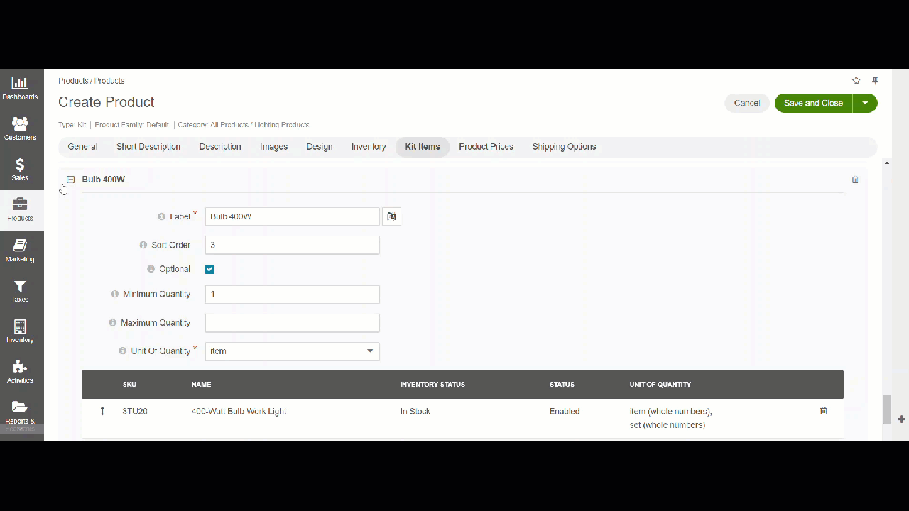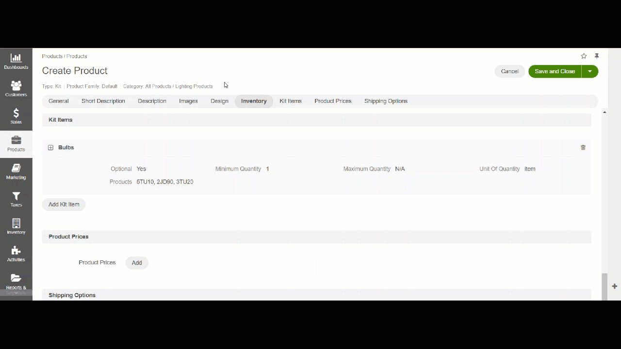 When you are ready to save the product, click Save and Close.