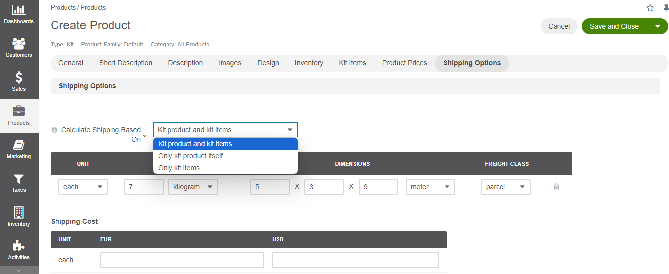 In the Shipping Options section, define how fixed shipping costs should be calculated for the selected product kit (available starting from OroCommerce v6.0.4). The field is only applied when calculating Fixed Product Shipping costs for product kits. The field has the following options: