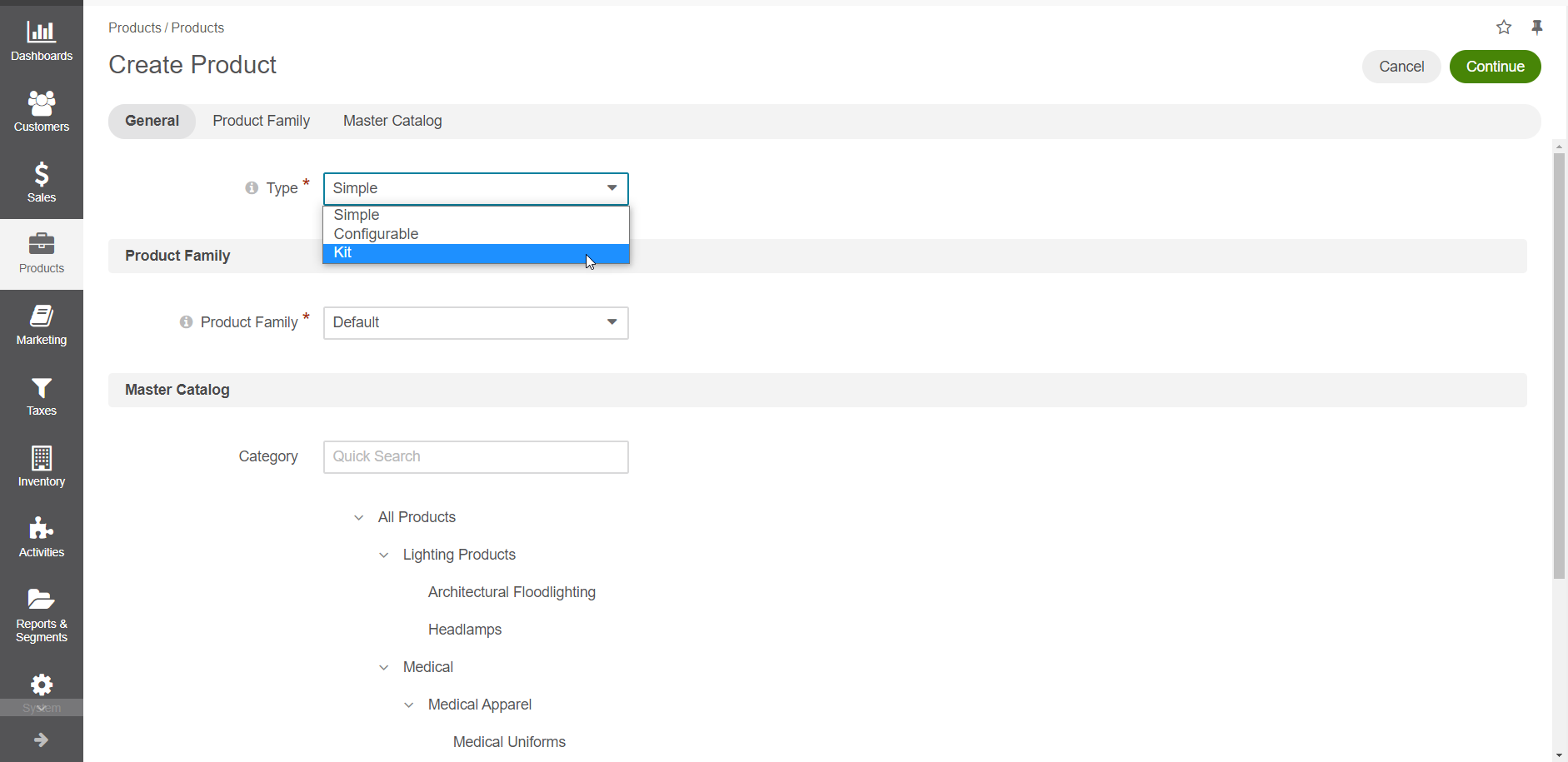 Select the product family to define the product options and details that will be filled in the following steps.