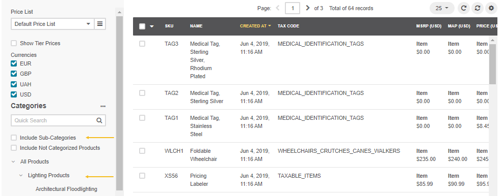 To display/hide the product from the sub-categories, select/clear the Include Sub-Categories checkbox in the left panel.