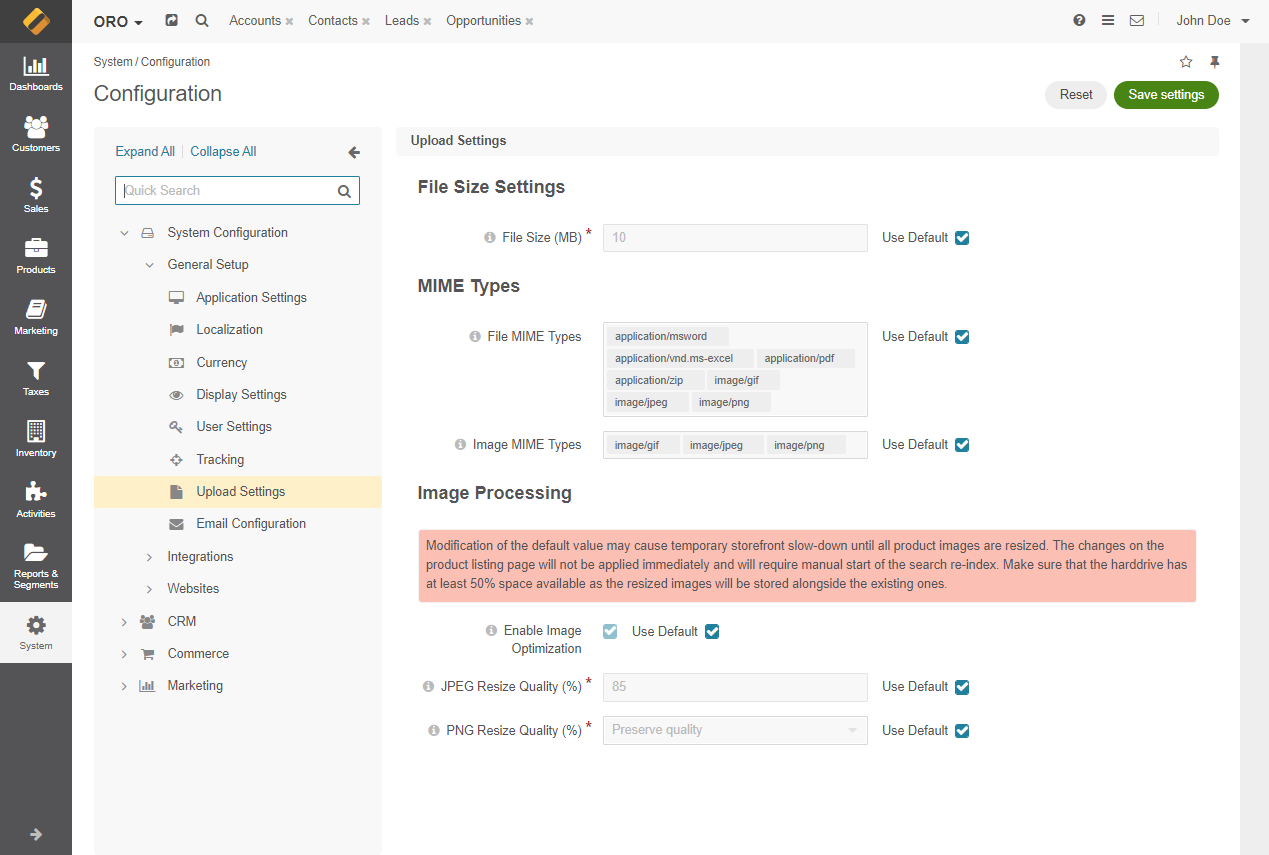 To define the size and formats of the files, reduce the size of images to be uploaded into the website back-office or the storefront, you need to configure the corresponding settings in the system configuration.