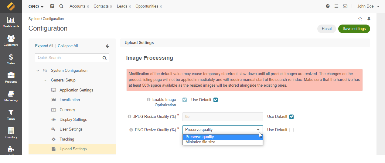 In the Image Processing section, you can control whether to optimize or not the size of the uploading images in the storage. By default, the setting is enabled, which means that the size of all images that you upload to the system is compressed while preserving the quality.