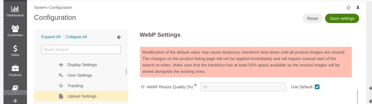 In the WebP Settings section, you can control the quality of the resized images in the WebP format. By default, images are additionally converted to the WebP format, so each image is provided to browser in two variants: a resized image in the original format and a resized image in the WebP format.
