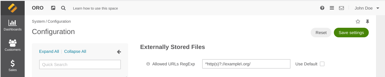 Allowed URLs RegExp — The setting determines the regular expression that describes allowed URLs for externally stored files and images. If left empty, no external files and images will be allowed.