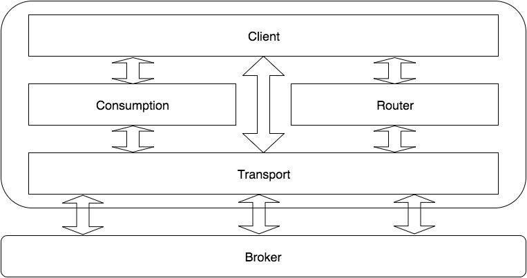 The lowest layer is called Transport and provides an abstraction of the transport protocol. The Consumption layer provides tools to consume messages, such as the CLI command, signal handling, logging, and extensions. It works on top of the transport layer.