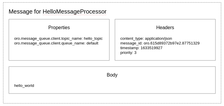 OroMessageQueue uses Publish/subscribe messaging. It means that the sending application publishes (sends) a message with a specific topic and a consumer finds a subscriber(s) for the topic. Publish/subscribe messaging allows decoupling of the information provider from the consumers of that information. The sending and receiving applications do not need to know anything about each other for the information to be sent and received.