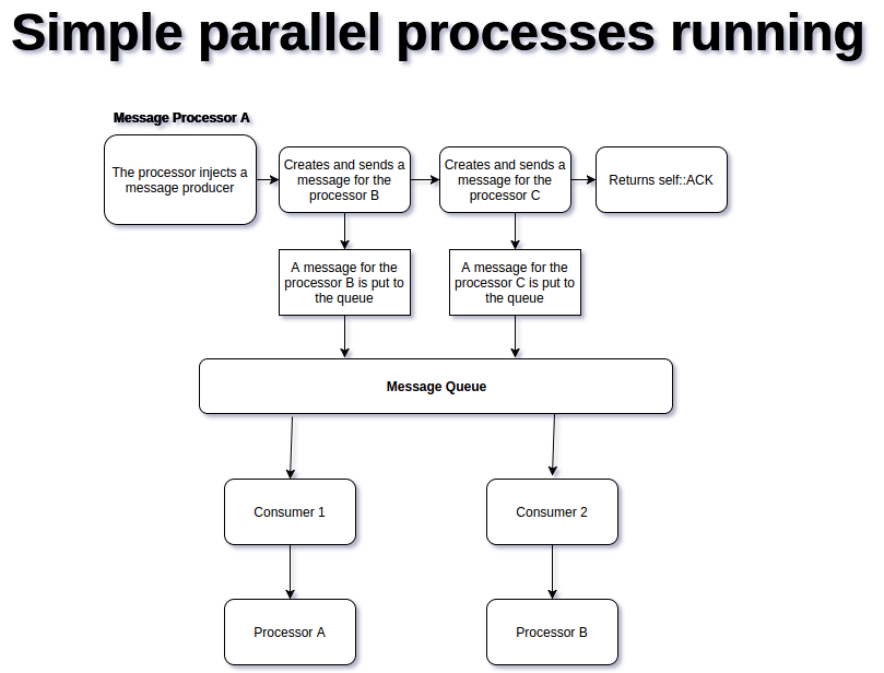 Let us imagine that we want to run two processes in parallel. In this case, we can create Processor B with the first process and Processor C with the second process. We can then create Processor A, inject Message Producer into it and send messages to Processor B and Processor C. The messages are put in the queue, and when their turn comes, the consumers run processes B and C. That could be done in parallel.