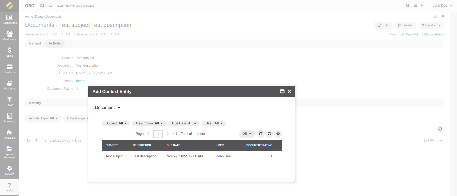 If you want to define a context grid for an entity (e.g., Document) in the activity context dialog, add the context option in the entity class #[Config] attribute, for example: