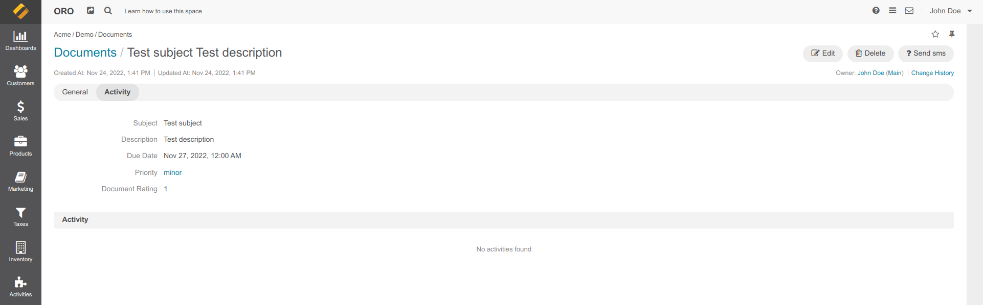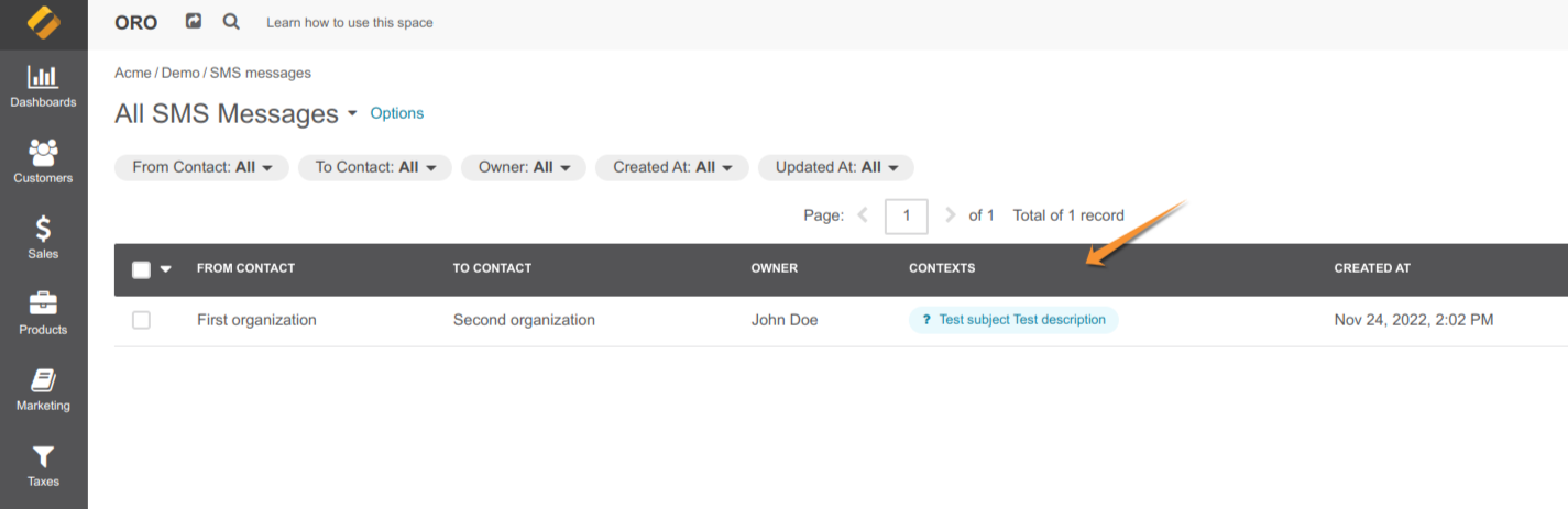 In the following example, the activity-sms-grid datagrid is used to render the list of activities. This grid is defined in the datagrids.yml file: