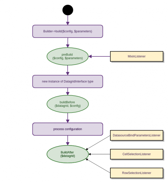 Datagrid\Builder class is responsible for creating and configuring an object and its data source. This is how the build method is processing the grid configuration internally: