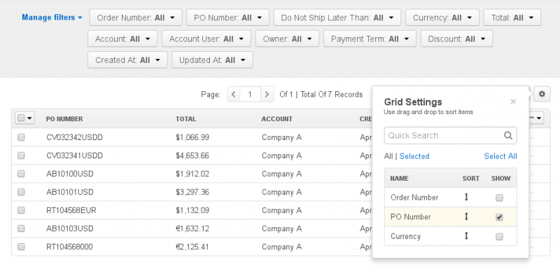 Imagine that you need to show a list of related price lists for every product record in the product grid. You want it to be displayed in a separate column with a multi-select filter. You also want to add one more column to display the owner of each of the product records.
