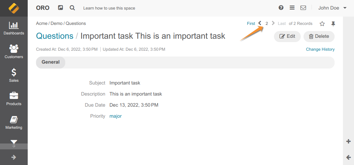 When a user comes from the grid with enabled entity pagination to the view or edit pages, grid parameters (filters, sorters, etc.) are transmitted as URL parameters in the browser address bar. Then, the entity pagination storage data collector sends a query to get all records with these grid parameters considering ACL permissions (for example, edit ACL might be stricter than view).