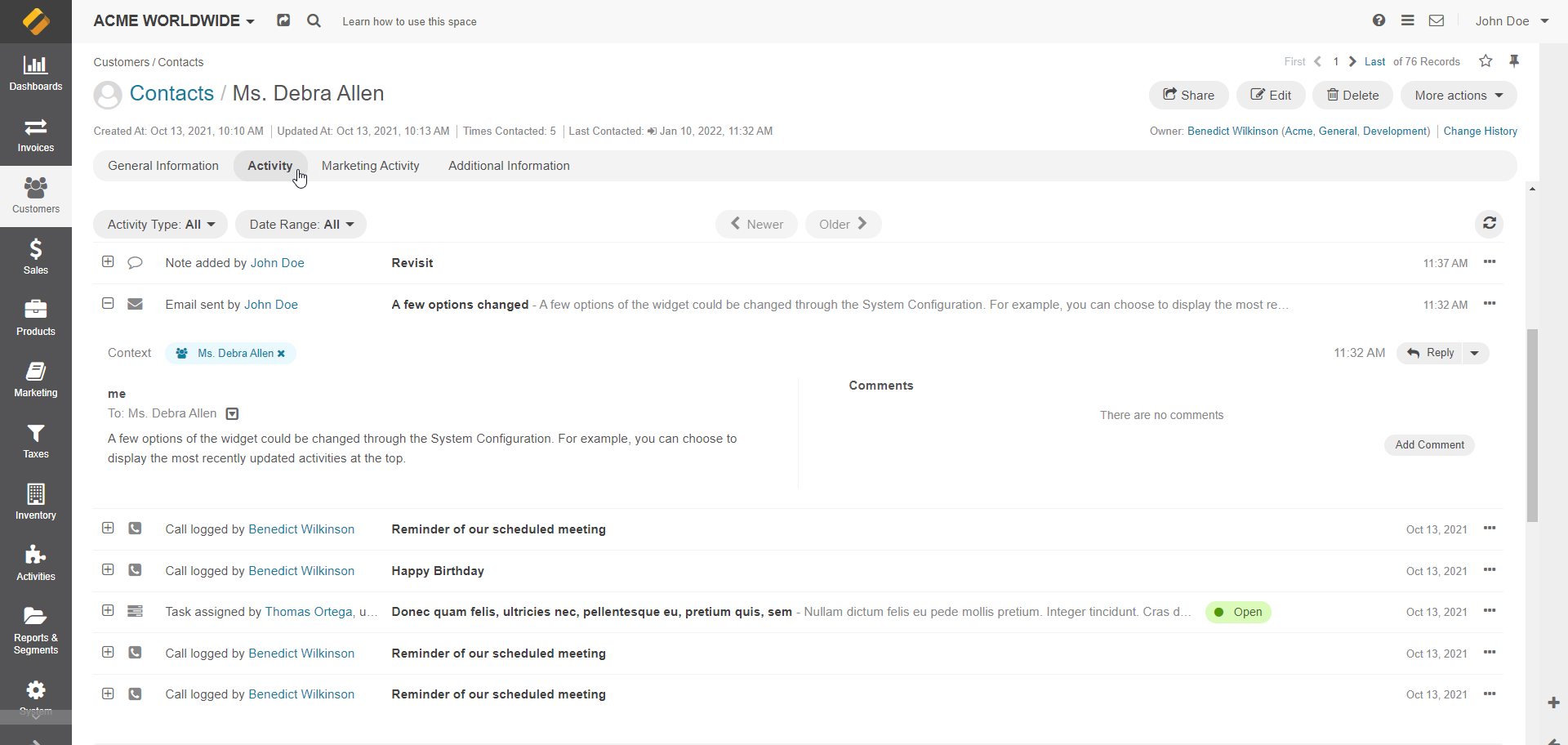 Each activity row shows basic information: the activity type, who and when created and updated it. You can also access the full activity record with the help of the “expand” action. By default, it displays 10 records sorted by the Update date in descending order. You can change the limitation and sorting in the UI via system configuration.