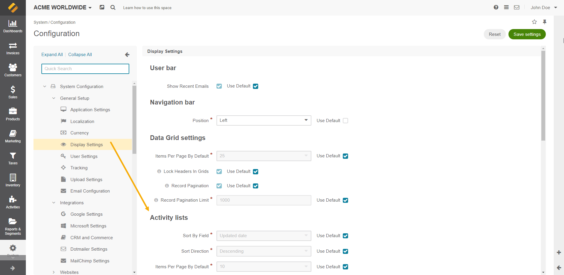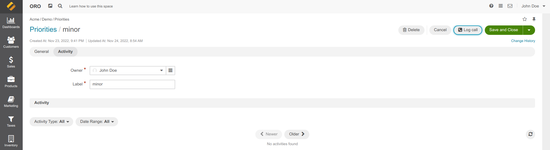 OroActivityListBundle adds a widget to the entity view page. The widget displays a list of activities related to the entity record in chronological order. It also enables widget configuration in the system configuration section.