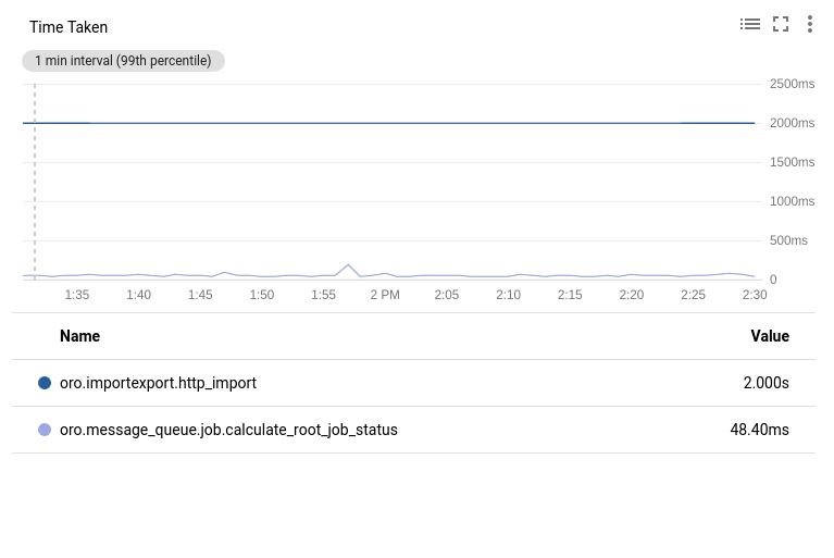 time_taken Name: topic, Label type: String, Field name: jsonPayload.extra.message_properties.”oro.message_queue.client.topic_name” Name: status, Label type: String, Field name: jsonPayload.status ms Distribution jsonPayload.time_taken Linear (setup current and below values by yours preferences) 5 200 10
