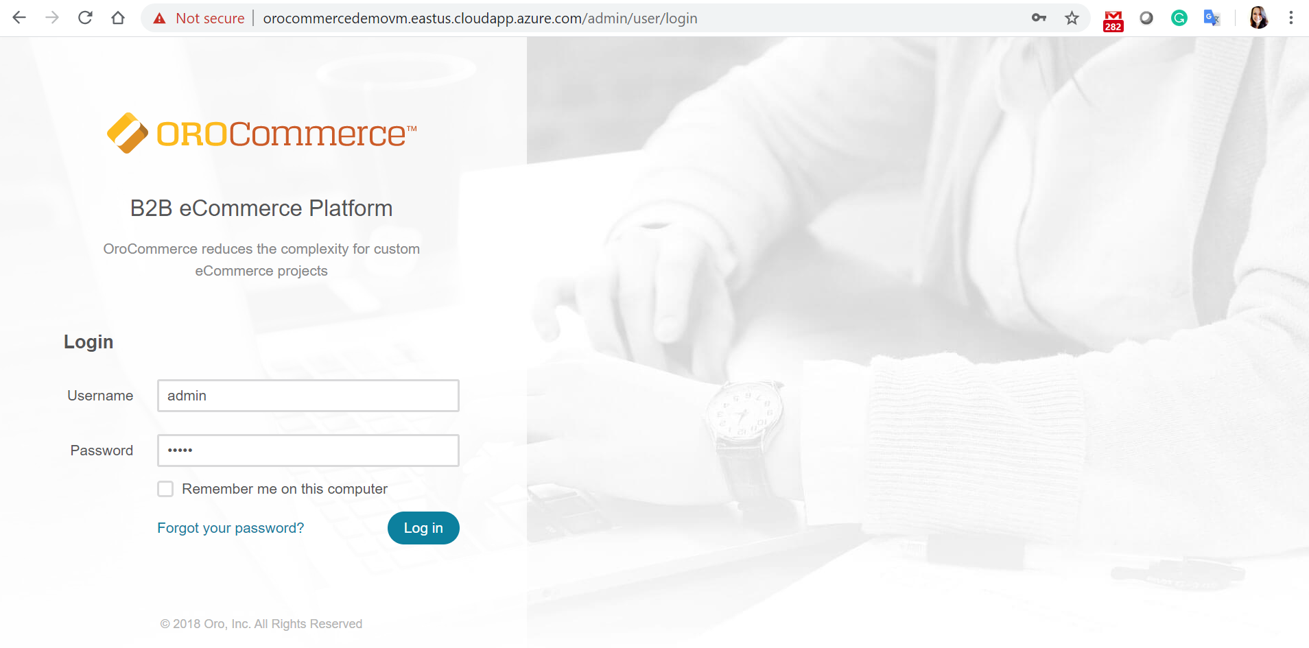 OroCommerce VM Demo Data: Use AmandaRCole@example.org both as your login and password to access the storefront (http://<DNSprefix>.cloudapp.azure.com). To access the back-office of the application (http://<DNSprefix>.cloudapp.azure.com/admin/admin), use admin as login and password. To access the application via SSH, specify your username and password or a public key, and restart services (systemctl restart oro*).