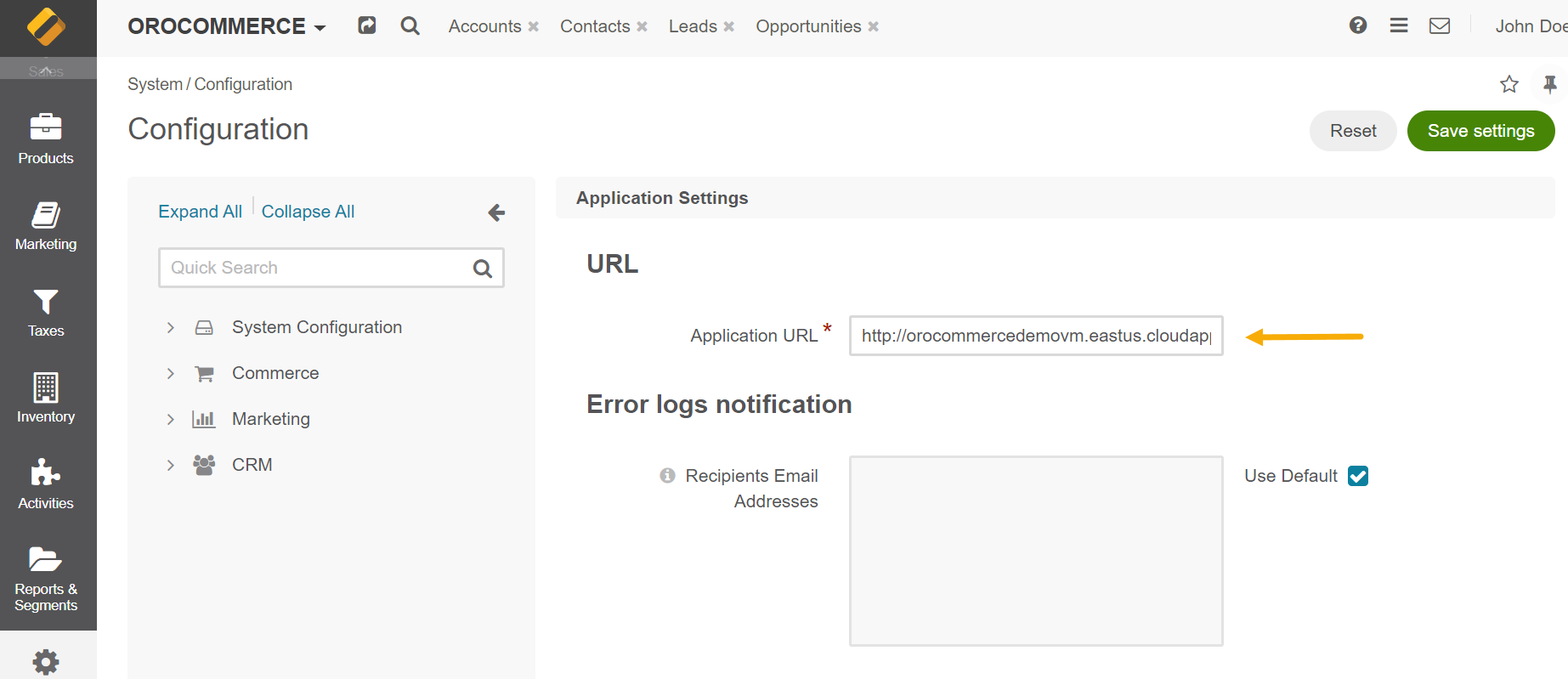 Navigate to System Configuration > General Setup > Application Settings in the application back-office, and provide the Application URL (e.g., http://<DNSprefix>.cloudapp.azure.com, or a different domain).