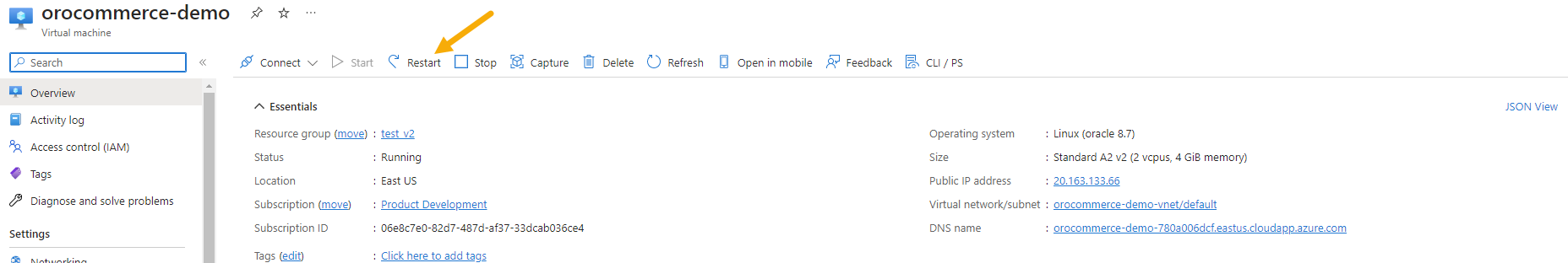 Return to the Azure Portal, and click Restart to reboot the virtual machine.
