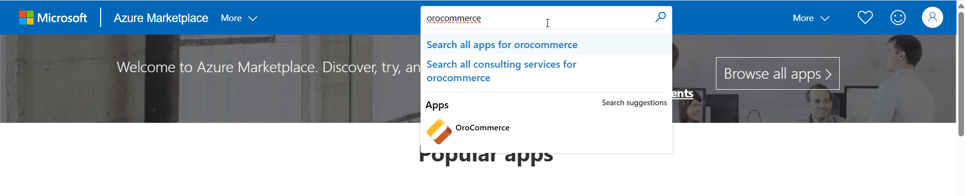 Navigate to Azure Marketplace and search for OroCommerce VM in the search bar.
