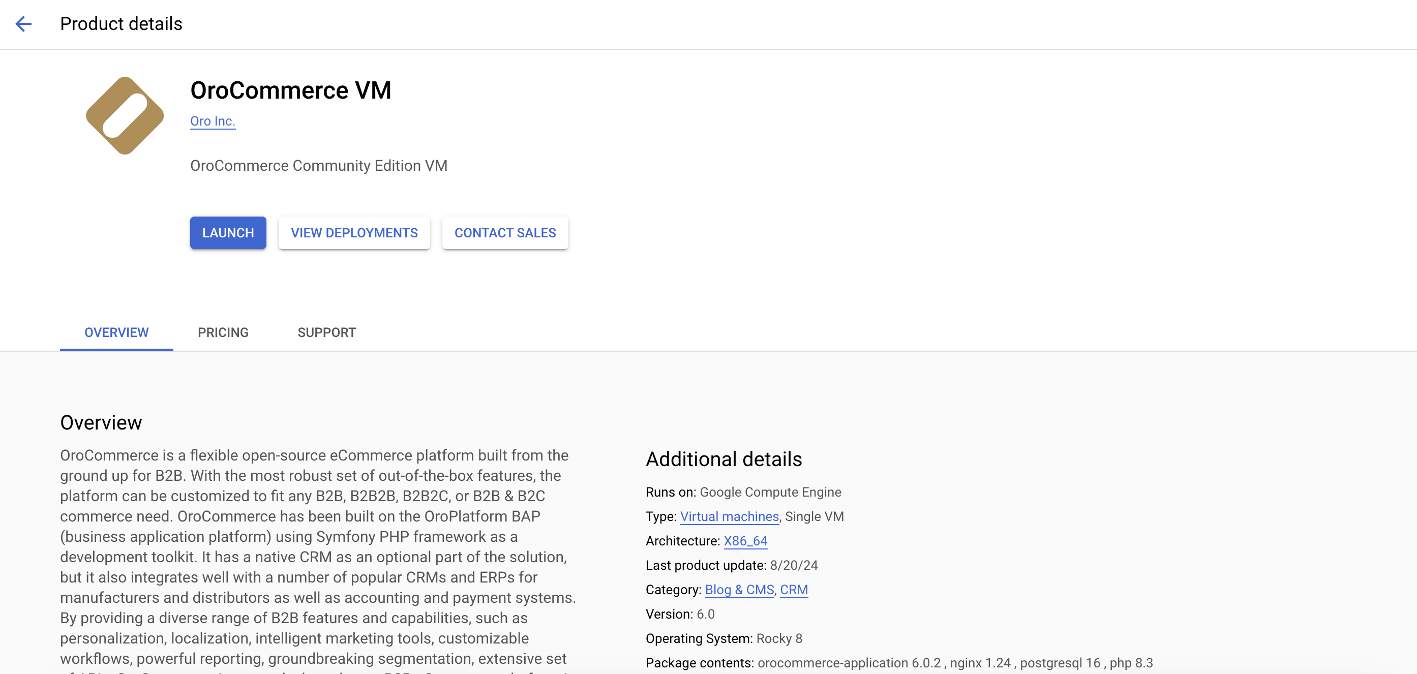 Google Cloud Platform enables you to deploy your Oro application instance in one click without manually configuring the software and settings. OroCommerce VM images comes with demo data and provides all the necessary information for you to test the application, such as a preconfigured list of customers, products, submitted orders, quotes, the structured master, and web catalogs. You can also explore the storefront using one of the pre-configured demo user roles. Sign in either as a guest user, a buyer (use BrandaJSanborn@example.org as your login and password), or a manager (use AmandaRCole@example.org as your login and password).
