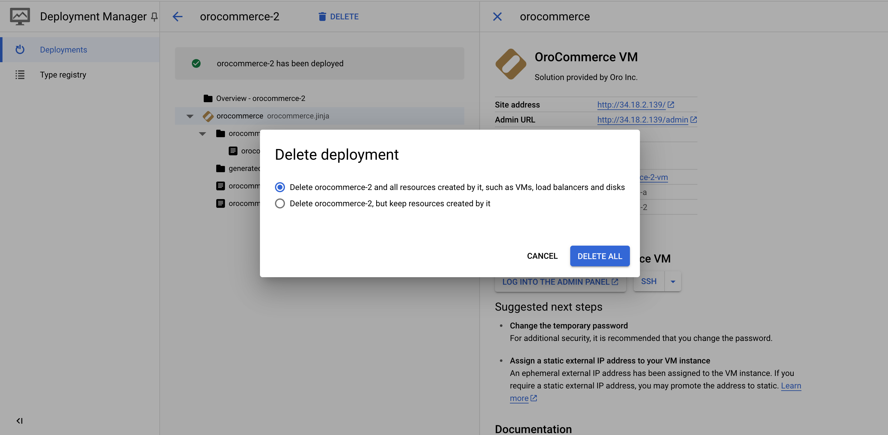 You can delete the deployment by clicking Delete on the upper left, next to the solution name. Resources created by this deployment, including VM instances, disks, and firewalls will be deleted as well.