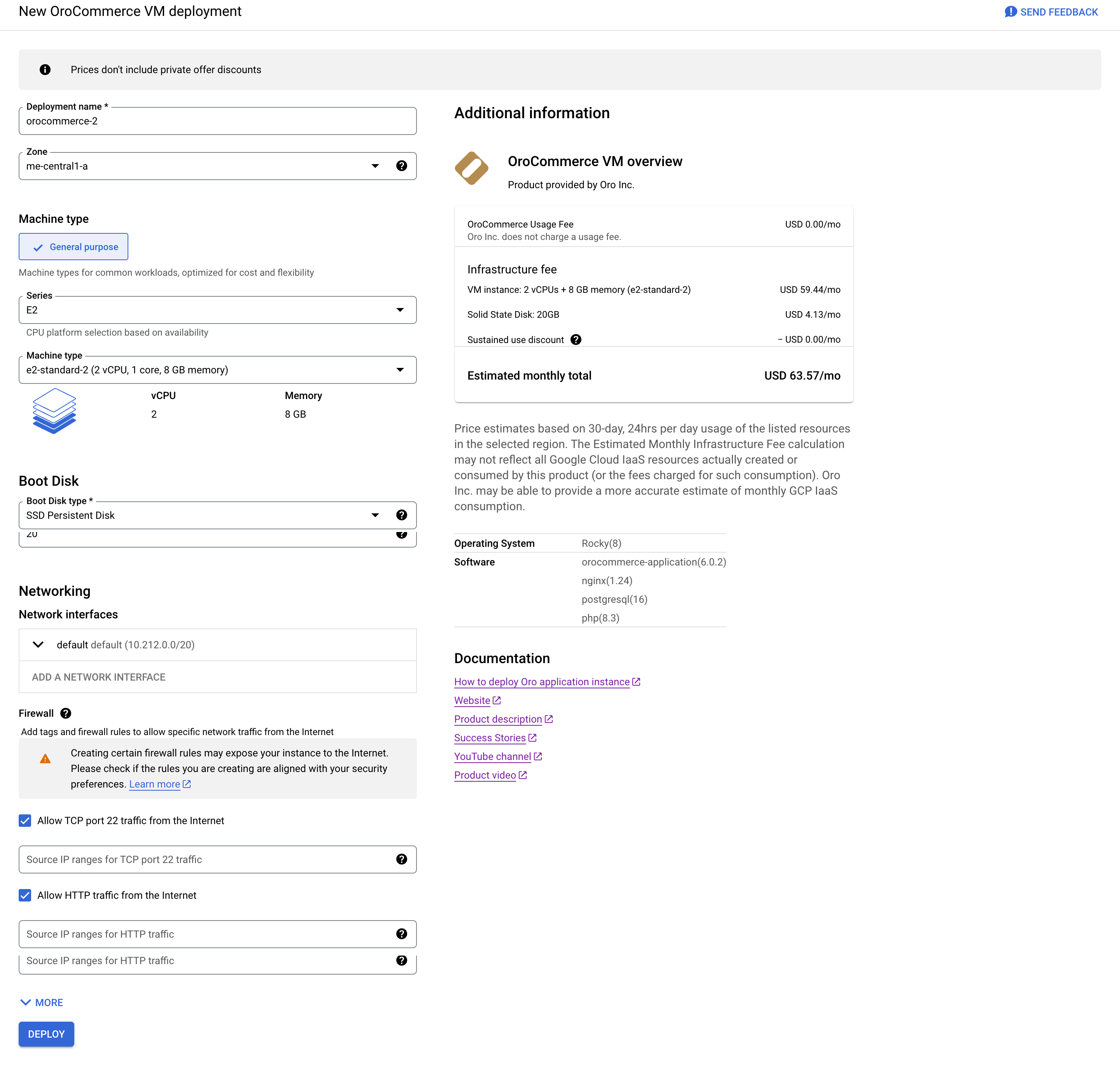 The Oro solution deployment page displays the default settings (e.g., name, zone, machine type, boot disk type, networking interfaces, etc.). You can accept or customize them if necessary.