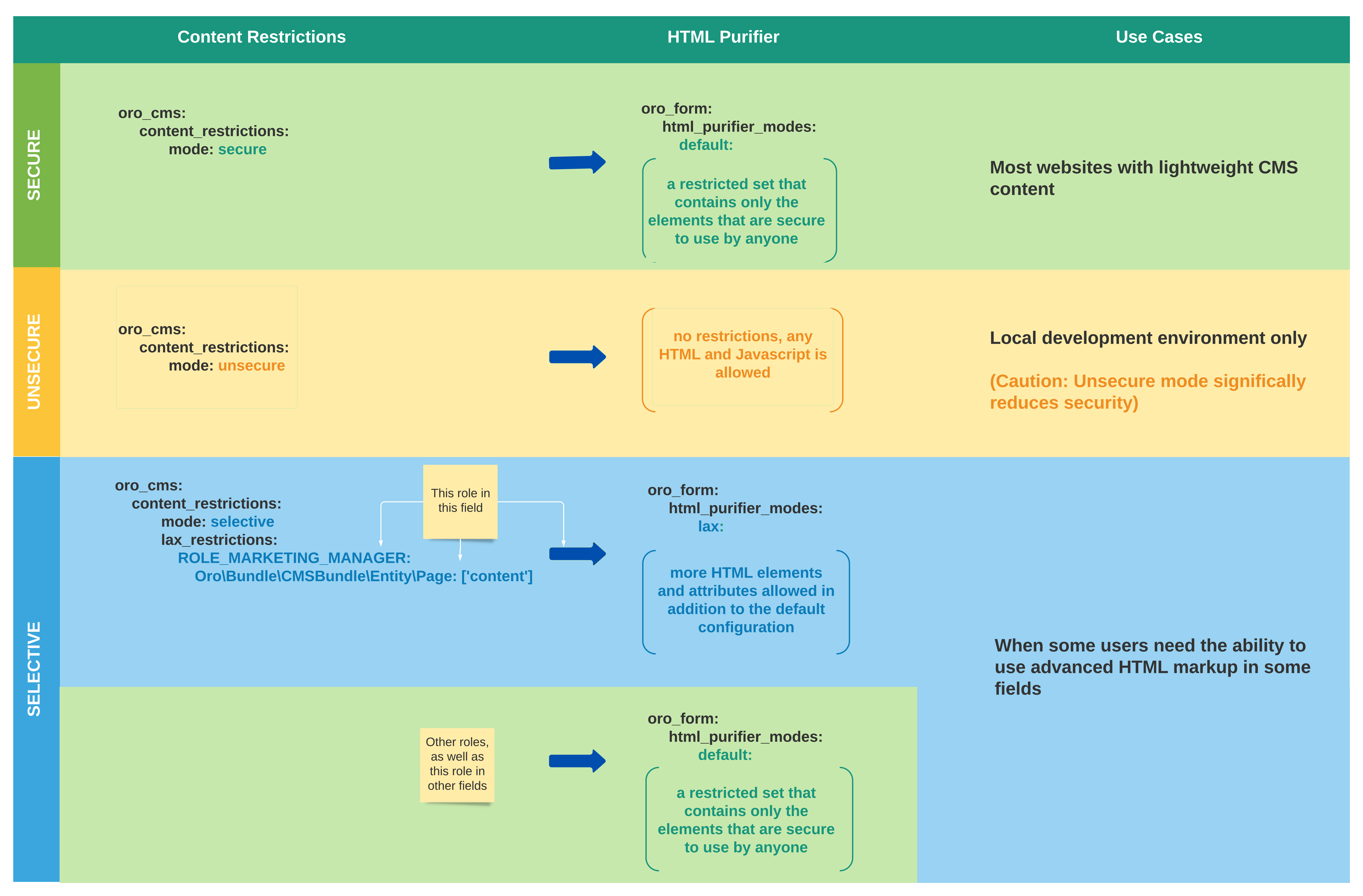 Out-of-the-box, all OroCommerce users can enter only safe content in the WYSIWYG fields from the application UI. OroCommerce uses content restrictions to ensure that the content displayed in the UI is secure and that users cannot embed unsecure markup.