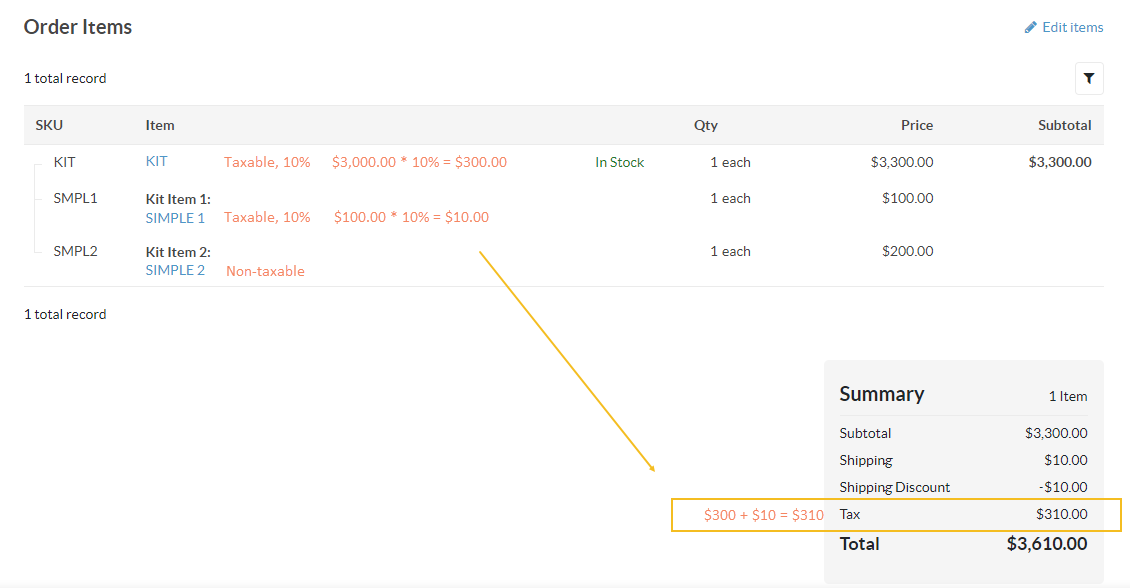 Typically, the total tax is calculated by adding up the taxes for each individual order line item. In terms of product kits, which can aggregate several products in the set, the taxes should be applied to each product kit line item. However, not all products within the set are taxable. In such cases, taxes need to be calculated individually for each product.
