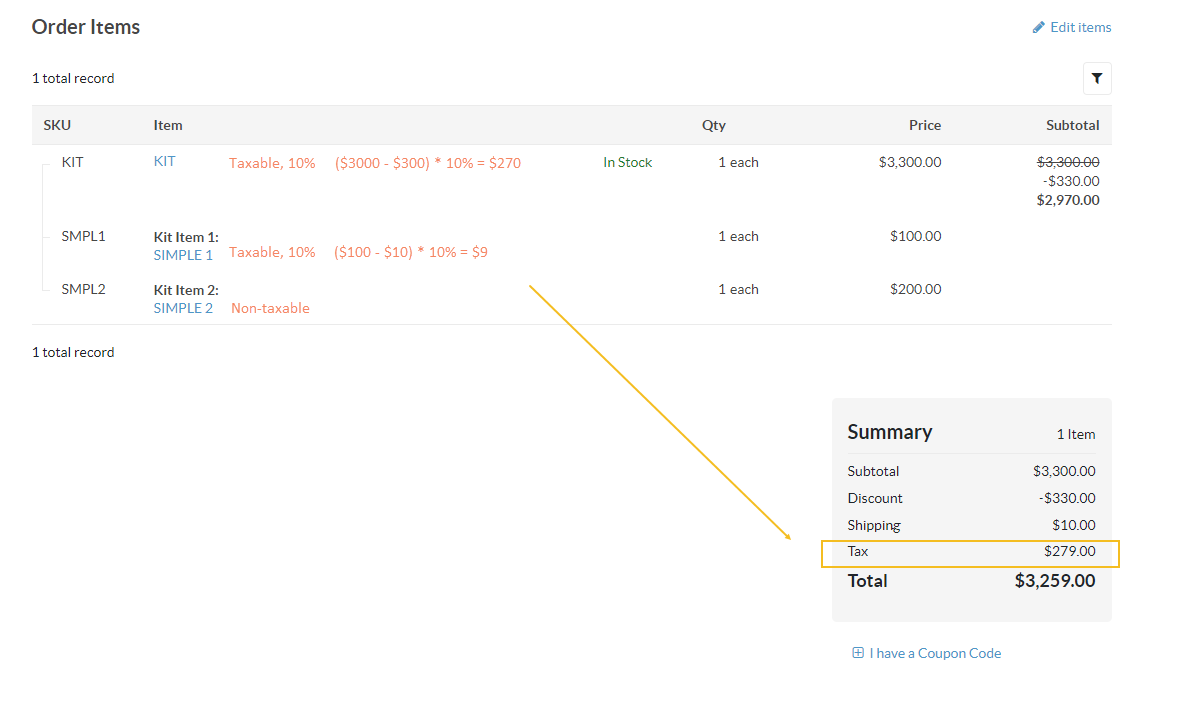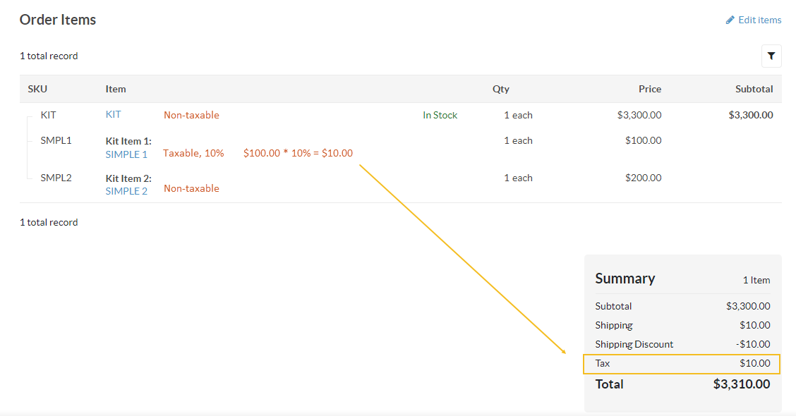 kit item 1 `SIMPLE 1` - $100, taxable