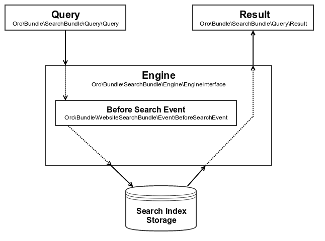 Search engine is an entry point in the Oro application that is used to perform search request. Search engine implements Oro\Bundle\SearchBundle\Engine\EngineInterface interface with one method - search(Query $query, array $context = []).