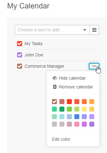 The calendar context menu is used to manage calendars on the My Calendar page. Available actions are: