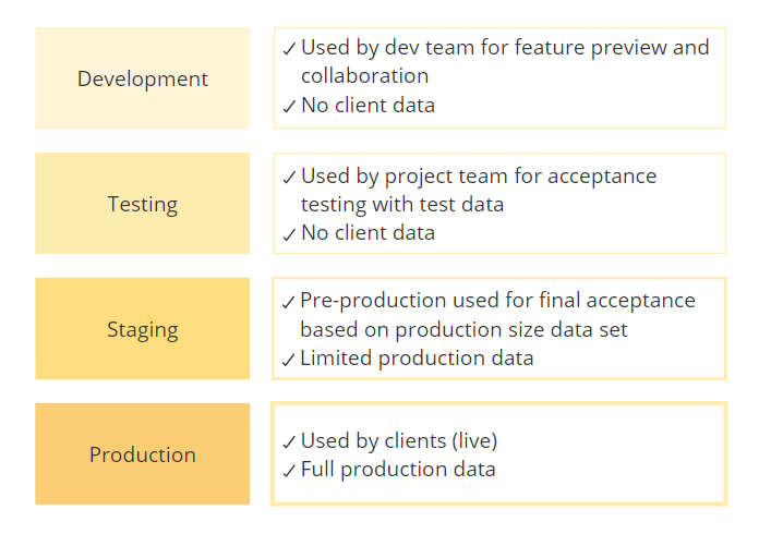 Software Development Lifecycle (SDLC) involves multiple activities, such as planning, analysis, design and development, different types of testing, deployment, and maintenance. These activities usually happen in various software environments, which could be classified as development, testing, staging, and production environments. Depending on your Oro license, you may have access to a different number and different types of OroCloud environments. However, out-of-license environments can also be requested for an additional cost.