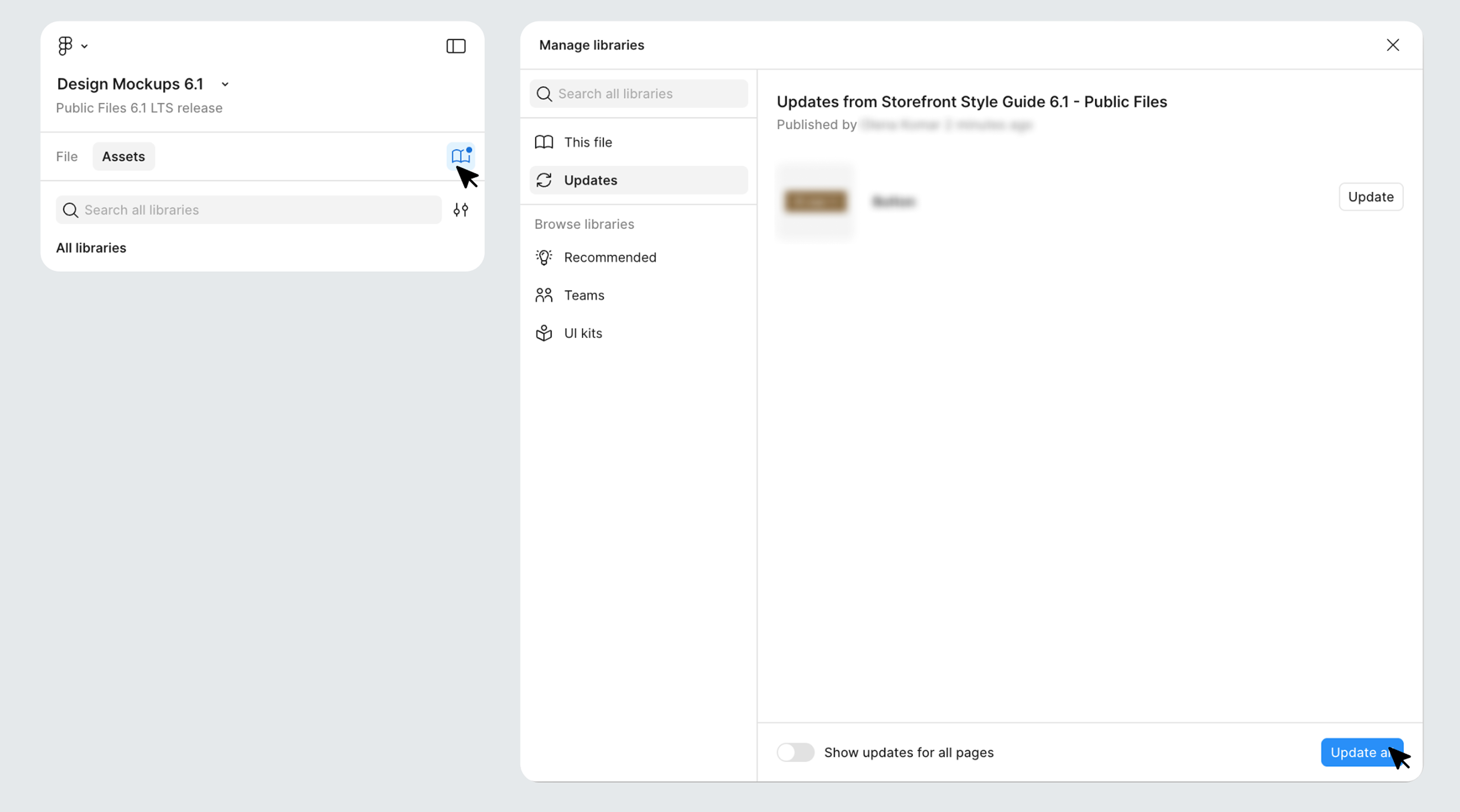 Once you have finished customizing the style guide and components library, please apply the changes to your work Figma file (the file with the design mockups) where this library has been added: