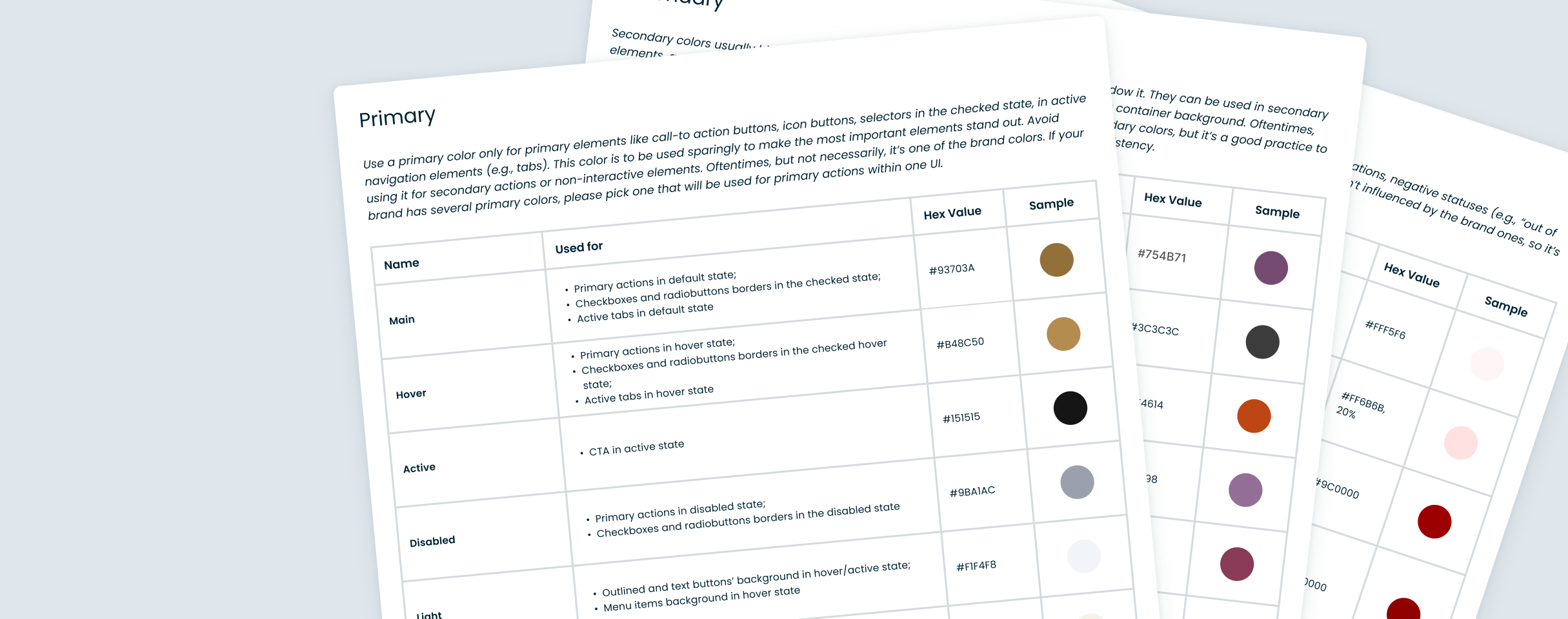 Styles with instructions on how to use them (colors, shadows and typography). You can change the styles to fit your company identity, publish library updates to your design work Figma file, and these styles will automatically be updated in every instance on every page that uses them.