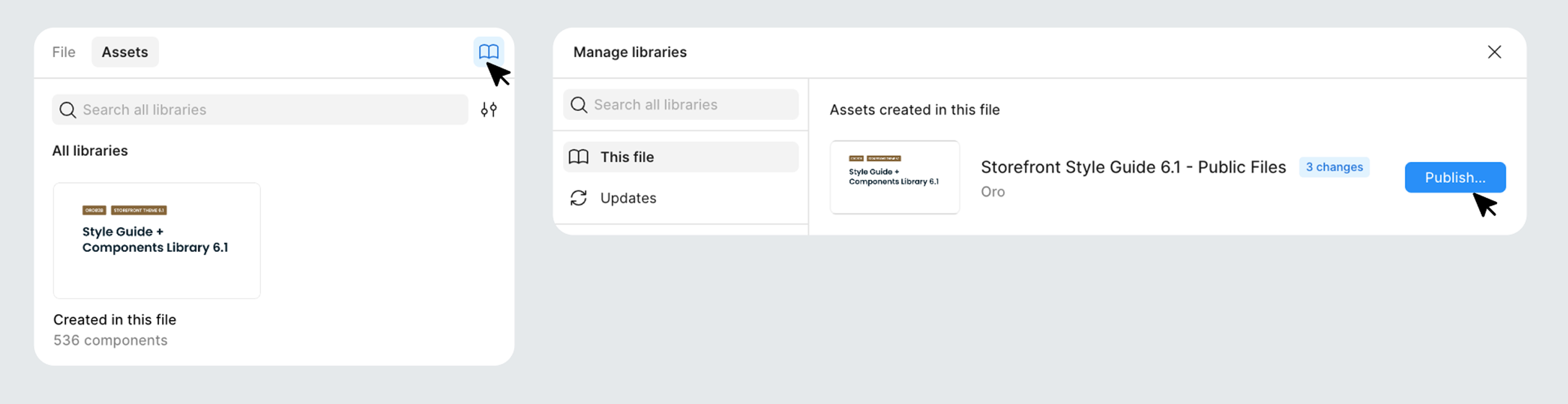 In the newly imported library file (Storefront Style Guide 6.1), open the Assets tab in the left panel and click on the book icon.