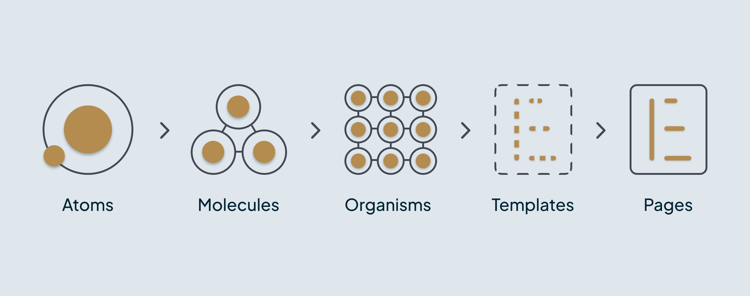 Molecules - groups of atoms that form relatively simple functional interface elements (pop-up, button with dropdown, navigation menu)