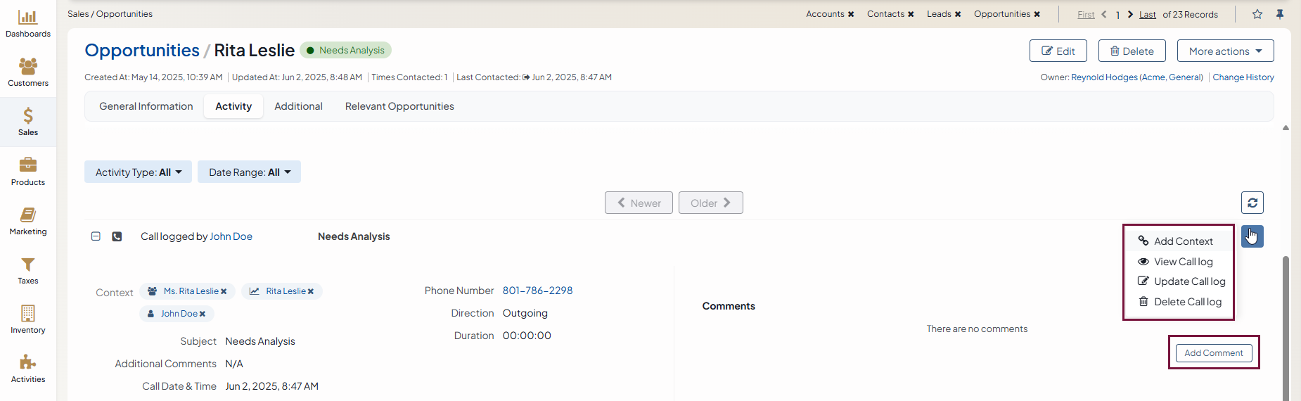 You can view, update, delete the existing call record, and add a context or a comment to it from the following pages in your Oro application: