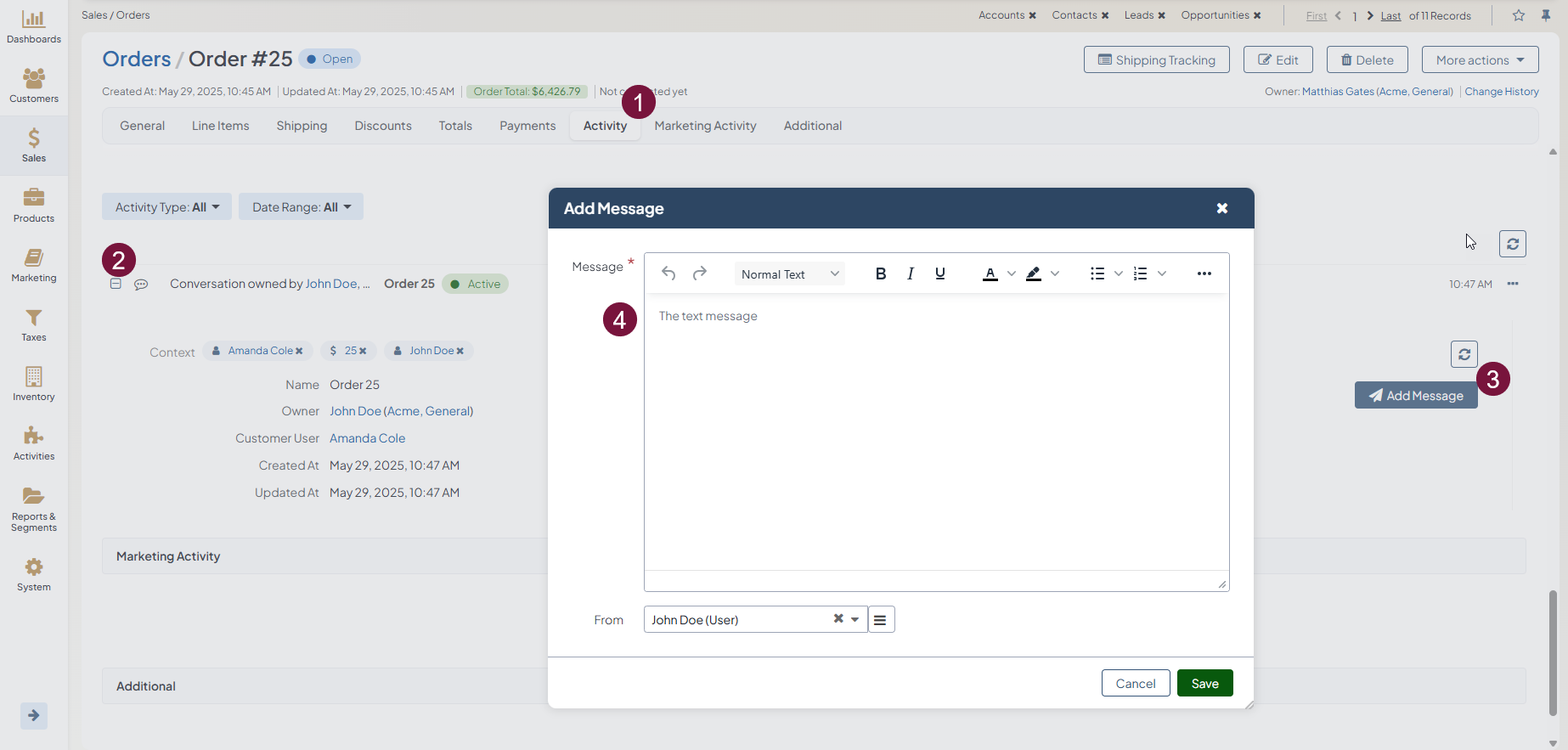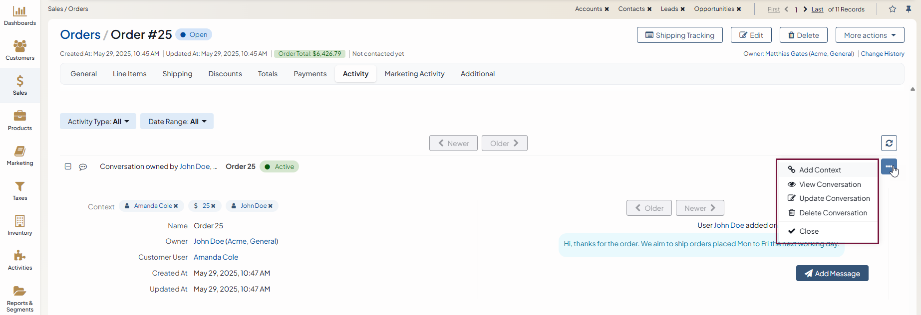 Context — An entity related to the conversation, e.g., a customer user. You can add more than one context to the field. When you add context of a record to the activity, it will be displayed in the Activity section of that record’s view page. This field is optional and can be left empty.