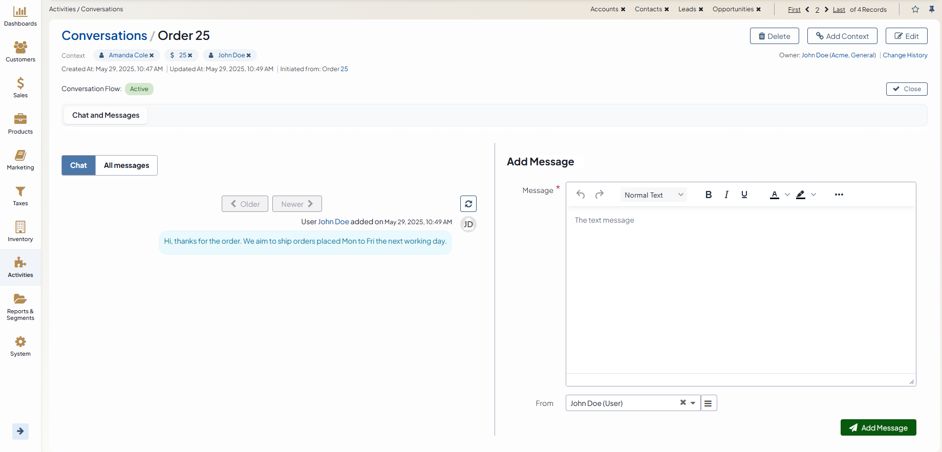 You can interact with the conversation via any record added as context as long as the conversation status is not Closed. If a context is removed from the conversation, the conversation disappears from the Activity section of that record’s view page.